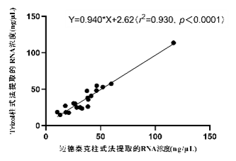 图3 迈德泰克全血RNA提取试剂盒(柱式法)提取的全血RNA与Trizol法的比较。A:两者提取浓度的相关性;B:260/280的比较;C:260/230的比较。